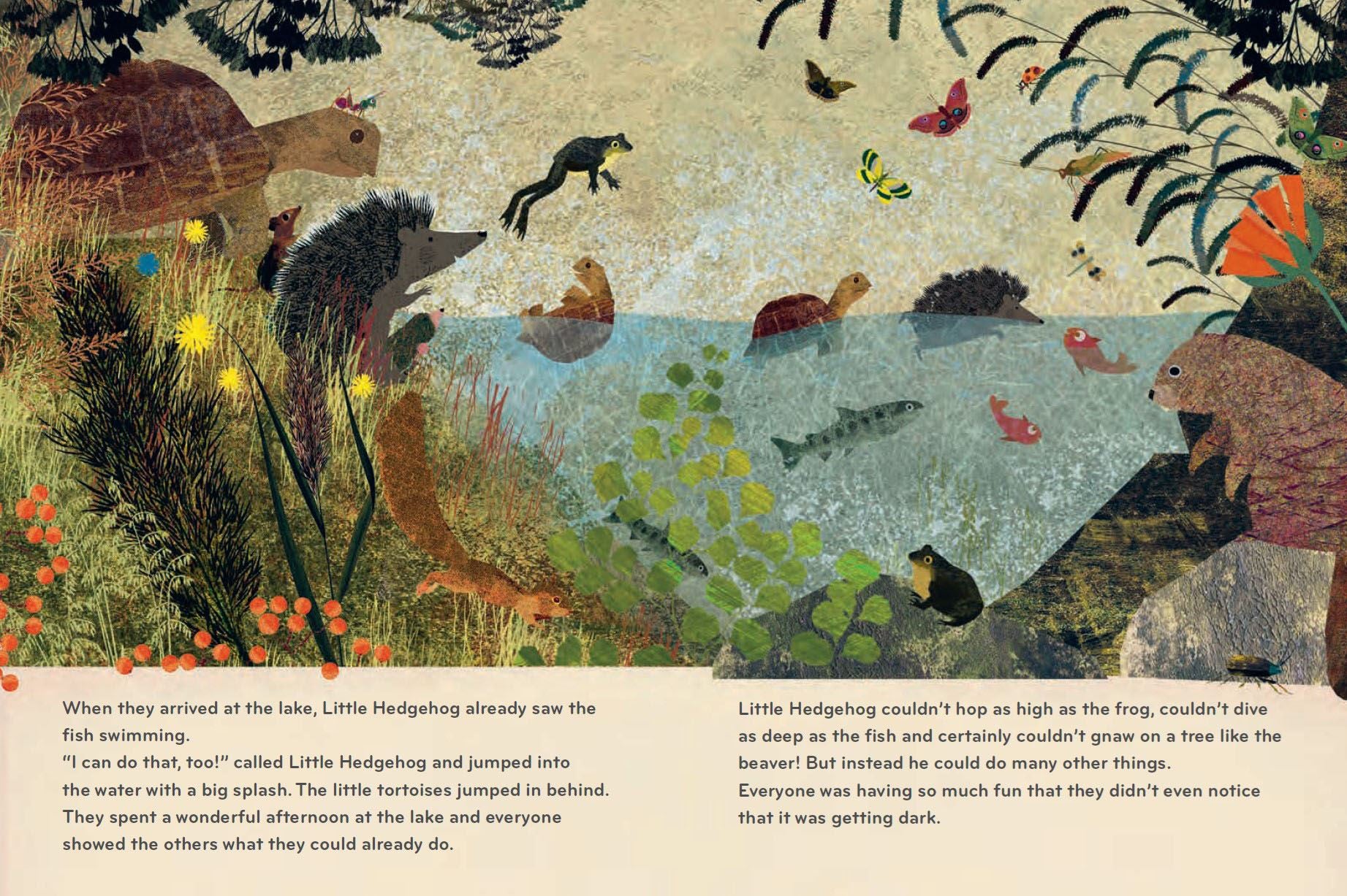 Today, in the woods, Big and Little Hedgehog are meeting some animal friends. Each of them can do something which Little Hedgehog wants to do himself. A ladybug can climb a tree and jump off a branch, a mole digs a hole, and fish swim in the pond. Little Hedgehog doesn’t always succeed, but he’s always keen to try something new. After the hedgehogs find their way home with the help of a turtle, an owl's hoot sends Little Hedgehog off to sleep with one last cry of "I can do that too!"